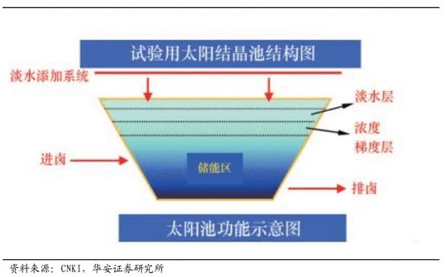 國內(nèi)西藏控股的扎布耶鹽湖太陽池沉淀法,如圖2所示,可以看作沉淀法的延伸。由于扎布耶鹽湖鎂鋰比極低,且為碳酸根型,為全球唯一采用該工藝的鹽湖。經(jīng)鹽田池冷凝蒸發(fā)后得到富鋰鹵水,在灌入太陽池,太陽池效應會使池溫升高,逐漸使碳酸鋰結晶析出。相比于南美的沉淀法,扎布耶鹽湖所需的鹽田建設和曬鹵周期要求降低,并且由于該鹽湖本身富含碳酸根,部分省略了化學沉淀鋰的步驟。