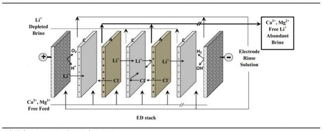 電滲析裝置由一系列陰陽離子交換膜和陰陽極組成,溶液中陰陽離子可在電壓的作用下透過膜Li+可以透過帶負電的陽離子交換膜,很難透過帶正電的陰離子交換膜,而Mg2+很難透過一價選擇性陽離子交換膜,因此濃縮室中的Li+逐漸被富集,而Mg2+被截留在淡化室中,從而實現(xiàn)Mg/Li 的分離。