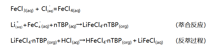 溶劑萃取法是利用溶質(zhì)在水相和有機相中溶解度或分配系數(shù)的不同,使溶質(zhì)從水相轉移到對溶質(zhì)有較大溶解度的有機相,從而達到溶質(zhì)轉相分離的目的。磷酸三丁酯(TBP)是一種典型的中性有機磷萃取劑,其用于鹽湖鹵水提鋰,常用的萃取體系為TBP-FeCl3-MIBK,反應機理如下: