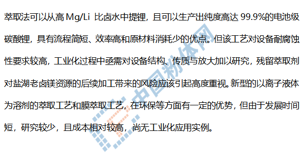 沉淀法工藝發(fā)展較早,具有工藝技術成熟、操作可靠性高等優(yōu)點,但對于我國以高鎂鋰比型鹽湖鹵水為原料的生產(chǎn)過程,普遍存在堿性沉淀劑的使用量較大、生產(chǎn)成本較高和對鋰的選擇性較差等問題,尚不適用于我國鹽湖鹵水工業(yè)化應用。