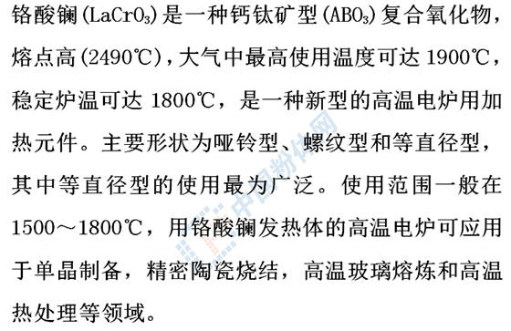 其主要優(yōu)點(diǎn)是能夠在大氣氣氛下使用到1900℃(表面溫度),可獲得1800℃的爐溫;能在氧化氣氛下連續(xù)長(zhǎng)時(shí)間使用,使用壽命可達(dá)3000h以上;可作為大小管式爐、箱式爐的發(fā)熱元件;用鉻酸鑭發(fā)熱元件裝配的電爐爐溫能夠精確控制,其爐溫穩(wěn)定度可在1℃之內(nèi)。