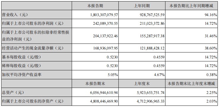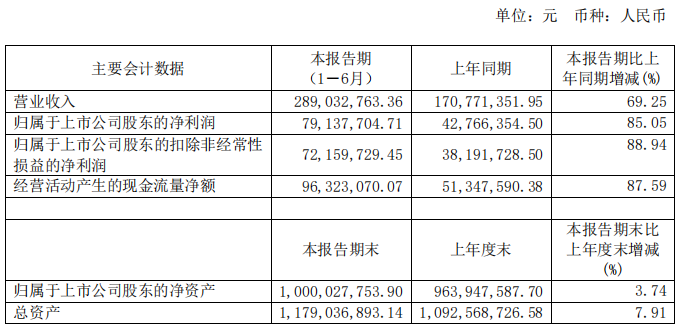 公告顯示,聯(lián)瑞新材半年度營業(yè)收入289,032,763.36元,同比增加69.25%,歸屬上市公司股東的凈利潤79,137,704.71元,同比增加85.05%。
