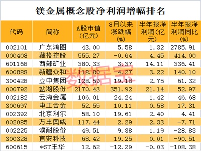 從業(yè)績(jī)數(shù)據(jù)來(lái)看,上半年9只鎂金屬概念股實(shí)現(xiàn)同比增長(zhǎng),其中廣東鴻圖、藏格控股、西部礦業(yè)、新疆眾和等4股凈利潤(rùn)翻倍增長(zhǎng)。廣東鴻圖凈利潤(rùn)增速排在第一位,上半年隨著國(guó)內(nèi)經(jīng)濟(jì)及乘用車(chē)市場(chǎng)復(fù)蘇,公司銷(xiāo)售收入較上年同期有較大幅度增長(zhǎng),上半年實(shí)現(xiàn)盈利1.32億元,同比增長(zhǎng)27.86倍。