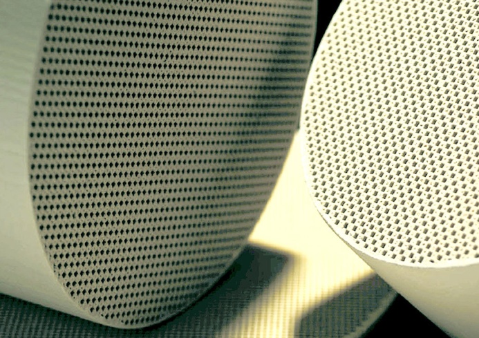 蜂窩陶瓷載體是一種具有高目數(shù)、大比表面積、高抗壓強度、低熱膨脹系數(shù)、優(yōu)異抗熱沖擊性能的陶瓷載體,常用堇青石和碳化硅材質(zhì),廣泛應(yīng)用于車用尾氣凈化處理的催化轉(zhuǎn)化器,對汽車排放廢氣中的有害氣體進行催化轉(zhuǎn)化、固態(tài)顆粒物進行過濾攔截,滿足日趨嚴苛的排放法規(guī)。