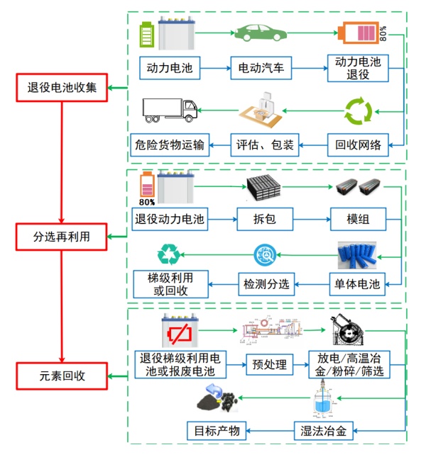 針對(duì)目前中國(guó)使用數(shù)量巨大的三元鋰電池和磷酸鐵鋰電池,退役的磷酸鐵鋰電池仍具有較好的循環(huán)性和安全性,因此對(duì)其先進(jìn)行梯次利用,再進(jìn)行資源的再生利用;而退役的三元鋰電池隨循環(huán)次數(shù)的增多容量呈現(xiàn)快速衰減趨勢(shì),且安全性較 差,對(duì)其破碎、拆解和冶煉等,實(shí)現(xiàn)鎳、鈷、錳、鋰等資源的再生利用。