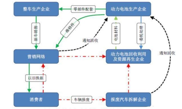 ▲電動(dòng)汽車及動(dòng)力電池生產(chǎn)企業(yè)為主力的報(bào)廢動(dòng)力電池回收產(chǎn)業(yè)鏈