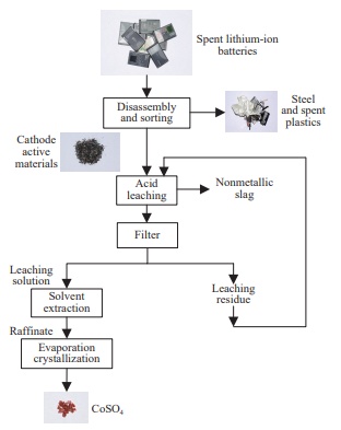 3)采用酸/堿溶液將電極材料中的金屬元素浸出,通過(guò)萃取和沉淀的方法實(shí)現(xiàn)金屬的分離和純化,以金屬或其他化合物的形式加以回收。萃取是關(guān)鍵一步,將銅與鈷、鎳分離;銅進(jìn)入電積槽進(jìn)行電積產(chǎn)生電積銅產(chǎn)品;經(jīng)萃取后的鈷、鎳溶液再進(jìn)行萃取分離,這時(shí)經(jīng)過(guò)結(jié)晶濃縮,直接得到鈷鹽和鎳鹽;或者經(jīng)萃取分離的鈷、鎳分別進(jìn)入電積槽中,得到電積鈷和電積鎳產(chǎn)品。