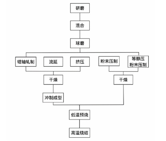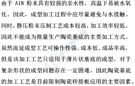 由于AlN陶瓷熔點(diǎn)高(2232℃)、硬度大,因此陶瓷基板的制備難度較大,通常采用低熔點(diǎn)玻璃或其他助熔劑摻雜的方式加工陶瓷。