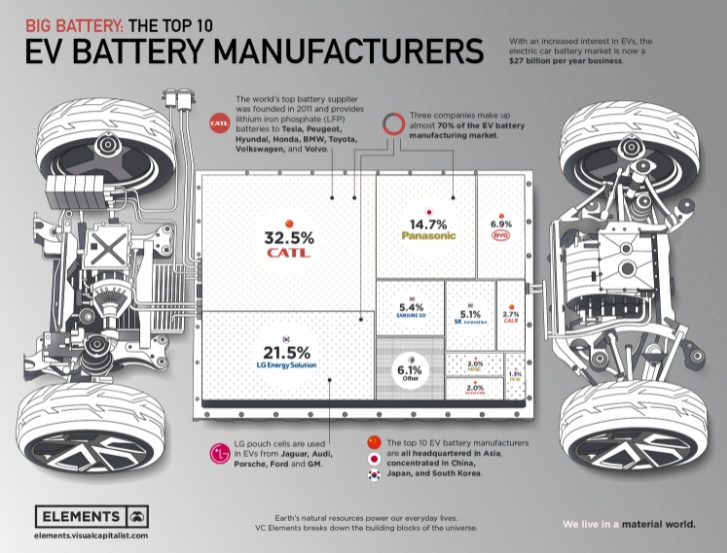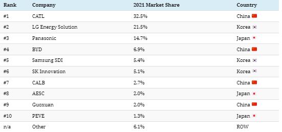 根據(jù)SNE研究公司的數(shù)據(jù),前三大電池制造商CATL、LG和松下吞下了近70%的EV電池制造市場。