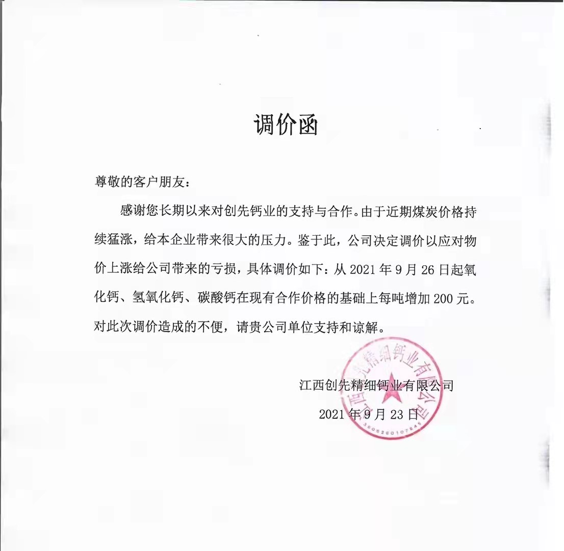 9月25日前后,受能耗雙控、原材料漲價(jià)、限電等因素影響,全國(guó)多家碳酸鈣企業(yè)開(kāi)始較大幅度上調(diào)產(chǎn)品價(jià)格,平均每噸價(jià)格上漲約100~150元左右。