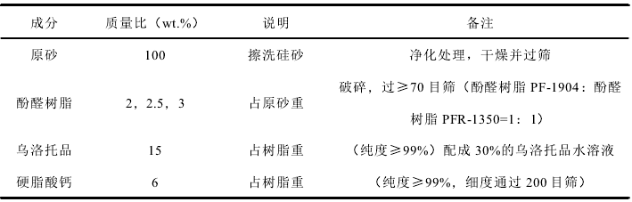 覆膜砂主要包含95%~99%的石英砂和1%~5%的樹(shù)脂;诩す3D打印技術(shù)的特殊成形方式與工藝特點(diǎn),在能夠保障燒結(jié)件滿足使用性能指標(biāo)的前提下,盡量使其具有較高的強(qiáng)度,較好的成型性,較低的發(fā)氣性,良好的透氣性。通過(guò)對(duì)粘結(jié)劑配比的調(diào)節(jié)以及其他添加劑的加入,不斷對(duì)覆膜工藝進(jìn)行優(yōu)化,制備適用于激光3D打印用新型覆膜砂材料。