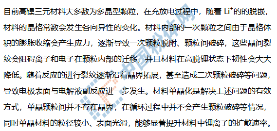 NCM三元材料雖然比容量較高,但存在循環(huán)性能差、倍率性能不佳等缺陷。造成這些缺陷的原因主要有:1)鋰離子擴散系數(shù)較小,極化較大,電導率差;2)鎳鋰混排。Ni2+與Li+離子半徑相似,容易在燒結(jié)過程中占據(jù)彼此的位置,造成充電過程中鋰層中的Ni2+被氧化為Ni3+和Ni4+,但放電過程中鎳離子無法脫嵌造成較大的不可逆容量;3)鎳的含量越高,材料的堿性越大,材料表面的碳酸鋰會造成材料在高溫下脹氣,過多的氫氧化鋰造成材料堿性過高,使材料在勻漿過程中形成果凍狀,無法涂布。針對這些缺陷,研究學者們通過元素摻雜、表面包覆、單晶化的方式對材料進行改性。