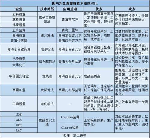 鹽湖提鋰技術(shù)路線需要因湖制宜,針對(duì)不同鹽湖特征,國(guó)內(nèi)已開發(fā)出離子交換吸附法、萃取法、膜分離法、電滲析法、煅燒法、太陽(yáng)池法、電化學(xué)法等提鋰技術(shù)。具體如下: