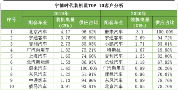 例如,寧德時(shí)代供應(yīng)特斯拉的動(dòng)力電池,目前僅供應(yīng)于特斯拉上海工廠。2020年寧德時(shí)代裝機(jī)配套TOP10客戶,分別是蔚來(lái)汽車、宇通客車、小鵬汽車、特斯拉、吉利汽車、長(zhǎng)城汽車、廣汽乘用車、理想汽車、東風(fēng)汽車和北京汽車。