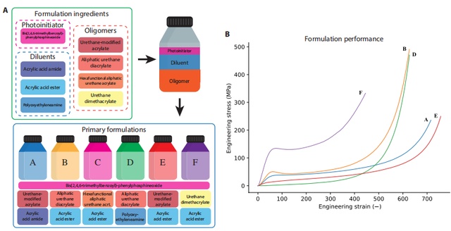 具體而言,關(guān)于基本成分和材料配方,研究人員首先生成了一組相互兼容的光固化初級配方,以混合并具有不同的機(jī)械性能,當(dāng)然,他們并不是從頭開始開發(fā)打印材料,而是首先確定了八種商用配方成分(包含一種光引發(fā)劑、三種稀釋劑和四種低聚物),然后,六種主要配方(A 至 F)由庫中的八種主要成分組成。