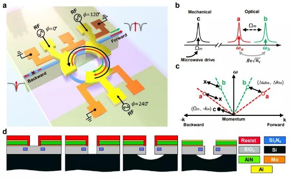 由于氮化硅缺乏電光效應(yīng),人們很難對氮化硅波導(dǎo)進(jìn)行快速有效的調(diào)制,而高效率的調(diào)制是整個(gè)光隔離器得以實(shí)現(xiàn)的關(guān)鍵。去年,該團(tuán)隊(duì)在利用激發(fā)聲波實(shí)現(xiàn)了對氮化硅光諧振腔的吉赫茲頻率的調(diào)制(該成果發(fā)表在 2020 年《自然-通訊》上),解決了這一問題;緊接著,他們將這個(gè)技術(shù)應(yīng)用在集成光頻率梳的高速聲光調(diào)制(該成果發(fā)表在 2020 年《自然》上)。與去年的工作不同的是,此次團(tuán)隊(duì)通過刻蝕底層的硅襯底,將聲波束縛在5微米厚的氧化硅薄膜上,從而極大提高了聲波的能量密度,從而將調(diào)制效率提高了 100 倍。這也有助于我們降低器件的功耗。