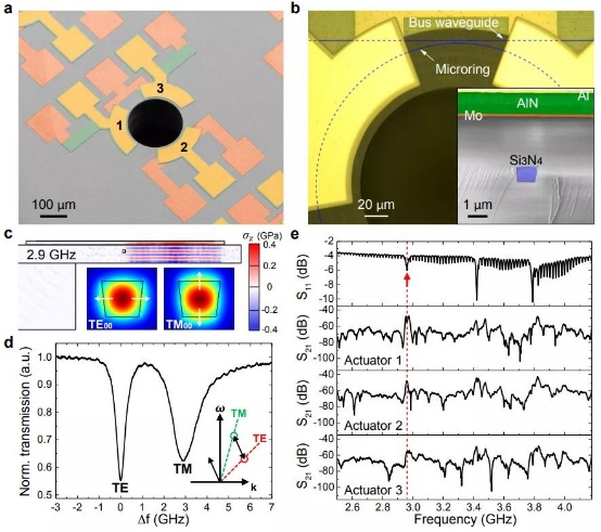 在氮化硅制成的微環(huán)諧振器(microring resonator)上,他們等間距地集成了三個(gè)氮化鋁(AlN)體聲波諧振器。氮化鋁(AlN)材料作為一種高效成熟的壓電材料,目前已經(jīng)被廣泛應(yīng)用在無線通訊領(lǐng)域,基于氮化鋁的體聲波濾波器幾乎被應(yīng)用在每一個(gè)手機(jī)芯片上,以接收無線信號。壓電材料是一種可以因機(jī)械變形產(chǎn)生電場的材料,家家戶戶都可見到的煤氣灶便是運(yùn)用了壓電效應(yīng):扭動(dòng)開關(guān),壓力產(chǎn)生的電流可以幫助煤氣灶迅即燃起藍(lán)色火焰。田浩與劉駿秋便是利用氮化鋁來激發(fā)聲波。當(dāng)聲波經(jīng)過光學(xué)微環(huán)諧振腔的時(shí)候,聲波產(chǎn)生的壓力會(huì)改變光波導(dǎo)的折射率,同時(shí)也會(huì)改變波導(dǎo)的形狀。這兩個(gè)效應(yīng)加在一起就對光波導(dǎo)產(chǎn)生了調(diào)制作用,而調(diào)制的頻率就是聲波震動(dòng)的頻率,一般是幾個(gè)吉赫茲(GHz)。