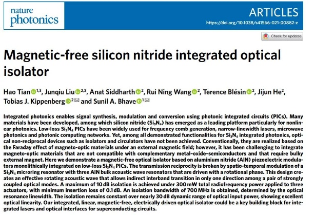 此項(xiàng)成果在 10 月 21 日以 Magnetic-FreeSilicon Nitride Integrated Optical Isolator 為題,發(fā)表在光學(xué)頂級期刊《自然-光子學(xué)》上,并同時(shí)在 MEMS 和光學(xué)領(lǐng)域獲得廣泛關(guān)注。美國普渡大學(xué)電子與計(jì)算機(jī)工程專業(yè)博士生田浩與瑞士洛桑聯(lián)邦理工學(xué)院(EPFL)劉駿秋博士為該篇文章的共同第一作者,洛桑聯(lián)邦理工學(xué)院教授 TobiasJ. Kippenberg 與普渡大學(xué)電子與計(jì)算機(jī)工程系教授 Sunil A. Bhave為共同通訊作者。此前,該項(xiàng)工作還在 2021 年的 IEEE MEMS 國際會(huì)議上獲得最佳學(xué)生論文的獎(jiǎng)項(xiàng),同時(shí)入選 2021 年國際光學(xué)會(huì)議 CLEO postdeadline 的會(huì)議報(bào)告。