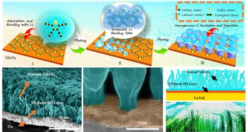在上述研究基礎(chǔ)上,該研究組進一步通過分子結(jié)構(gòu)設(shè)計將具有較大電負性和親鋰作用的含硫噻吩官能團與炔鍵相連,報道了一種通過誘導(dǎo)沉積的方法直接在集流體表面實現(xiàn)可控制備薄層海藻狀金屬鋰負極以提高鋰金屬電池循環(huán)穩(wěn)定性的方法。通過將具有較大電負性和親鋰作用的含硫噻吩官能團與炔鍵相連,可以實現(xiàn)噻吩炔表面鋰金屬的均勻成核和生長,并形成由單個金屬鋰棒形成的海藻狀金屬鋰薄層。通過理論計算明確了噻吩炔中均勻分布的硫原子與炔鍵形成的協(xié)同效應(yīng)增強鋰與成核活性位點之間的相互作用,優(yōu)化整個碳骨架區(qū)對于鋰的均勻吸附能力,同時利用硫原子調(diào)控電荷在鋰與噻吩炔界面的轉(zhuǎn)移與傳輸性能,降低鋰的成核過電勢從而誘導(dǎo)鋰均勻成核。研究結(jié)果表明,制備的海藻狀薄層金屬鋰與銅箔上直接沉積的塊狀金屬鋰相比,體現(xiàn)出較低的成核過電勢與界面阻抗,同時在對稱金屬鋰電池中表現(xiàn)出優(yōu)異的循環(huán)穩(wěn)定性。由海藻狀鋰金屬負極和Li4Ti5O12作為正極組裝的全電池在1000多個循環(huán)中具有優(yōu)異的容量保持率。
