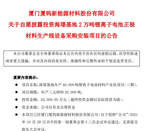 中國粉體網(wǎng)訊 近日,廈鎢新能公告,為發(fā)揮規(guī)模效應(yīng),滿足下游市場需要,廈門廈鎢新能源材料股份有限公司(以下簡稱“廈鎢新能”)擬在募投項目建設(shè)的同時,投資6.2億元,啟動海璟基地三期項目的建設(shè),進行海璟基地2萬噸鋰離子電池高鎳三元正極材料生產(chǎn)線設(shè)備采購安裝項目,項目計劃于2021年10月啟動,2022年7月投產(chǎn)。