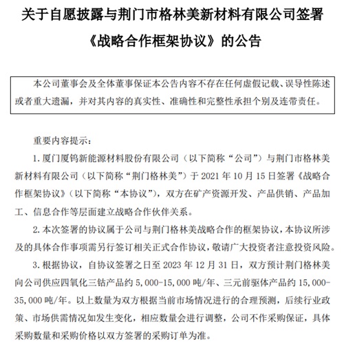 10月15日,廈鎢新能與荊門市格林美新材料有限公司(以下簡稱“荊門格林美”)簽署《戰(zhàn)略合作框架協(xié)議》,雙方在礦產(chǎn)資源開發(fā)、產(chǎn)品供銷、產(chǎn)品加工、信息合作等層面建立戰(zhàn)略合作伙伴關(guān)系。根據(jù)協(xié)議,自協(xié)議簽署之日至2023年12月31日,雙方預(yù)計荊門格林美向廈鎢新能供應(yīng)四氧化三鈷產(chǎn)品約5,000-15,000噸/年、三元前驅(qū)體產(chǎn)品約15,000-35,000噸/年。