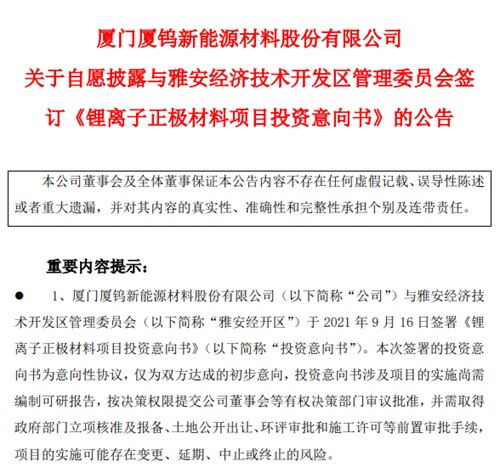 9月16日晚間,廈鎢新能公告,公司與雅安經(jīng)開區(qū)簽署了《鋰離子正極材料項目投資意向書》。廈鎢新能計劃在雅安經(jīng)開區(qū)投資建設(shè)鋰離子正極材料項目,預(yù)計投資意向不低于100億元,投資建設(shè)10萬噸磷酸鐵鋰、6萬噸三元材料等項目。