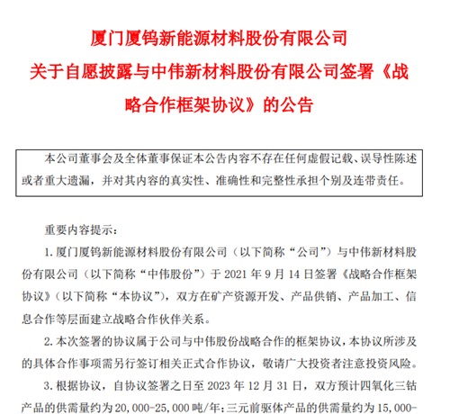9月14日,廈鎢新能與中偉新材料股份有限公司于簽署《戰(zhàn)略合作框架協(xié)議》,雙方在礦產(chǎn)資源開發(fā)、產(chǎn)品供銷、產(chǎn)品加工、信息合作等層面建立戰(zhàn)略合作伙伴關(guān)系。根據(jù)協(xié)議,自協(xié)議簽署之日至2023年12月31日,雙方預(yù)計四氧化三鈷產(chǎn)品的供需量約為20,000-25,000噸/年;三元前驅(qū)體產(chǎn)品的供需量約為15,000-35,000噸/年。若本協(xié)議的條款充分履行,有利于提升廈鎢新能的供應(yīng)鏈穩(wěn)定性。