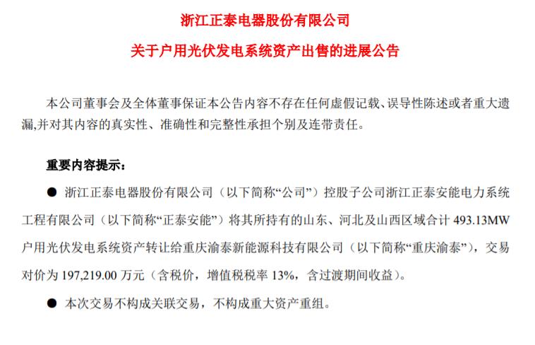 中國粉體網(wǎng)訊 11月15日,正泰電器公告稱,公司控股子公司浙江正泰安能電力系統(tǒng)工程有限公司 (簡稱 “正泰安能”) 將其所持有的山東、河北及山西區(qū)域合計493.13MW戶用光伏發(fā)電系統(tǒng)資產(chǎn)轉(zhuǎn)讓給重慶渝泰新能源科技有限公司 (簡稱“重慶渝泰”) ,交易對價為19.72億元。