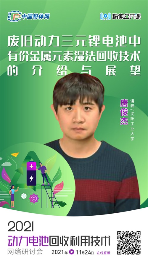 為破解廢舊動力三元鋰電池回收難題,中國粉體網(wǎng)旗下粉體公開課平臺將于2021年11月24日舉辦“2021動力電池回收利用技術(shù)網(wǎng)絡(luò)研討會”,屆時來自沈陽工業(yè)大學(xué)的唐俊杰老師將作《廢舊動力三元鋰電池中有價金屬元素濕法回收技術(shù)的介紹與展望》報告,報告人將介紹國內(nèi)外濕法回收廢舊動力三元鋰電池的研究進展及工藝特點,并對其技術(shù)未來發(fā)展方向進行展望。