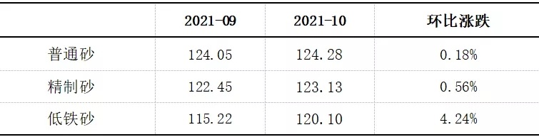 2021年9-10月石英砂細(xì)分產(chǎn)品價格指數(shù)環(huán)比變動表