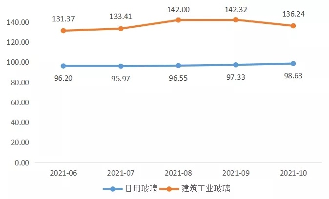 由圖可知,伴隨著下游消費(fèi)市場的復(fù)蘇,以及中秋、國慶雙節(jié)到來的“金九銀十”效應(yīng),消費(fèi)需求有所回暖,帶動日用玻璃需求上漲,10月日用玻璃價格延續(xù)上升走勢。此外,建筑工業(yè)玻璃價格指數(shù)收報于136.24點(diǎn),環(huán)比下跌4.27%。