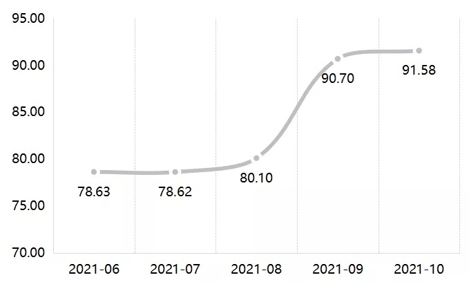 2021年10月,光伏玻璃價格持續(xù)上行,整體表現(xiàn)略有上漲,指數(shù)收報于91.58點(diǎn),環(huán)比微漲0.96%。