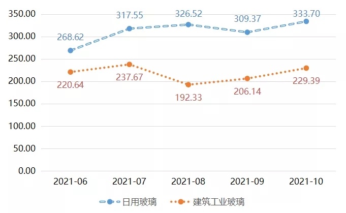 由圖可知,10月,日用玻璃、建筑工業(yè)玻璃價格指數(shù)分別收報于333.70點(diǎn)、229.39點(diǎn),環(huán)比分別上漲7.87%、11.28%,漲幅明顯。