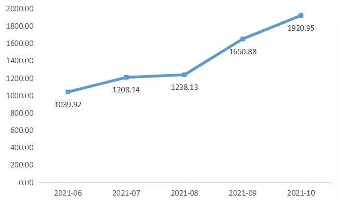 數(shù)據(jù)顯示,10月,光伏玻璃銷量持續(xù)快速上漲,指數(shù)收報于1920.95點(diǎn),環(huán)比上漲16.36%,具體如下圖所示。