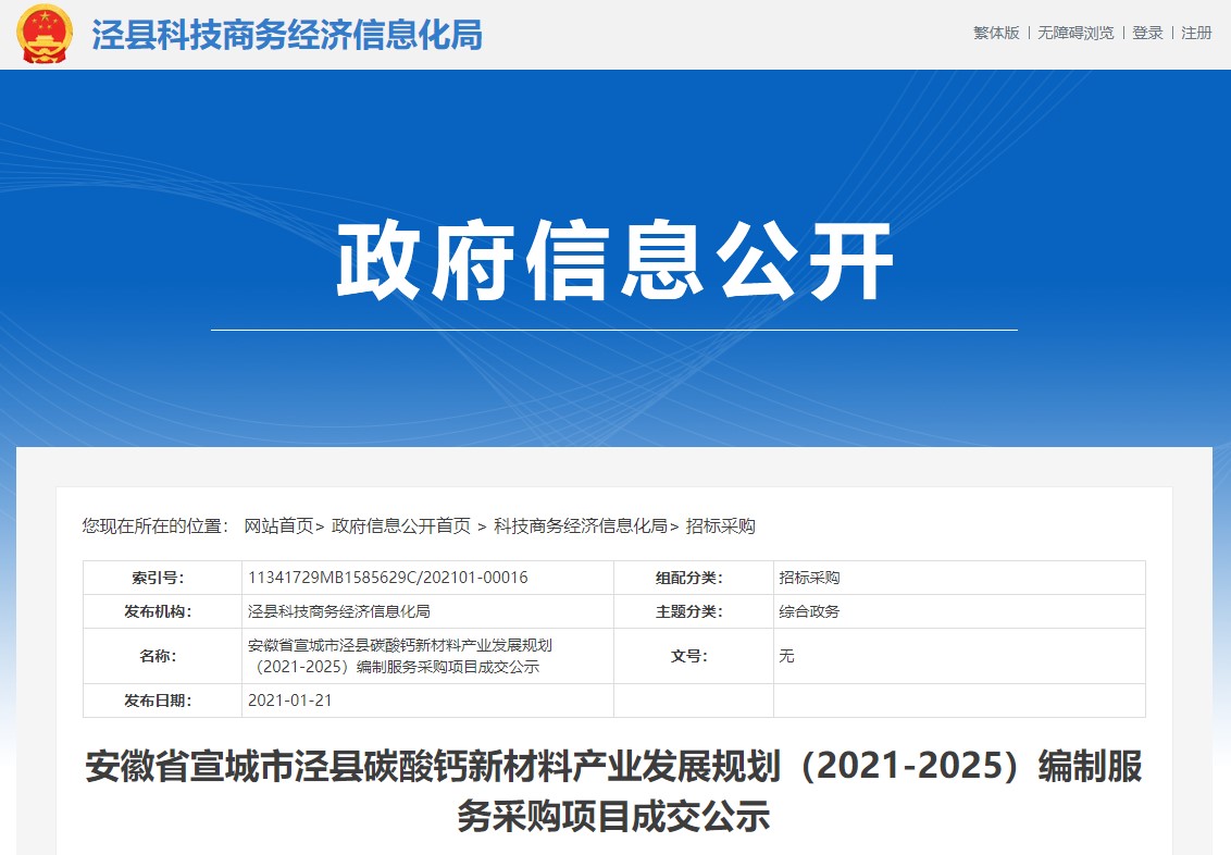 2021年1月21日,據(jù)涇縣科技商務(wù)經(jīng)濟(jì)信息化局公示,安徽省宣城市涇縣碳酸鈣新材料產(chǎn)業(yè)發(fā)展規(guī)劃(2021-2025)編制服務(wù)采購項目成交。2021年6月30日,安徽省宣城市涇縣碳酸鈣新材料產(chǎn)業(yè)發(fā)展規(guī)劃(2021-2025)專家評審會在涇縣召開,一致同意通過《規(guī)劃》評審,并建議盡快安排規(guī)劃方案的落地實施。