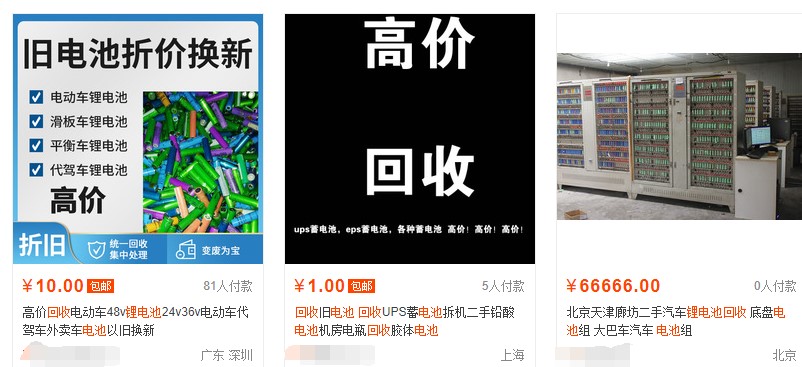 圖:在某電商平臺(tái)上隨處可見(jiàn)的鋰電池回收賣家