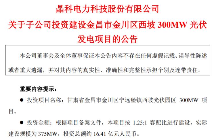 中國粉體網(wǎng)訊 12月8日,晶科科技發(fā)布公告,公司全資下屬公司金昌晶科擬投建甘肅省金昌市金川區(qū)西坡300MW光伏發(fā)電項(xiàng)目,實(shí)際建設(shè)規(guī)模為375MW,投資總額約16.41億元。本項(xiàng)目擬拆分為兩個(gè)150MW(實(shí)際建設(shè)規(guī)模為187.50MW)的子項(xiàng)目,并由金昌晶科的全資子公司金昌市晶亮電力有限公司和金昌市晶陽電力有限公司各自承建和運(yùn)營。