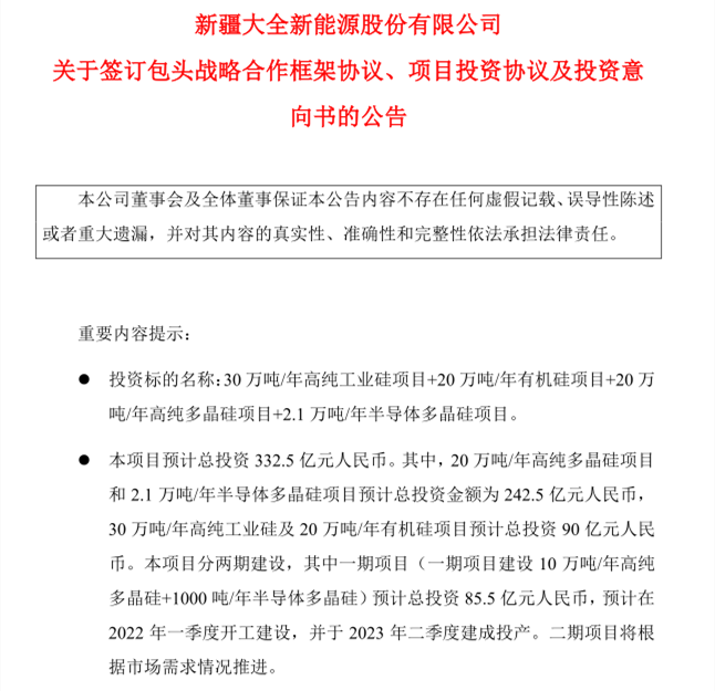 中國粉體網(wǎng)訊 12月21日,大全能源發(fā)布《關(guān)于簽訂包頭戰(zhàn)略合作框架協(xié)議、項(xiàng)目投資協(xié)議及投資意向書的公告》。公告披露大全能源與包頭市政府簽署戰(zhàn)略協(xié)議,計劃投資332.5億元人民幣在包頭市投資建設(shè)30萬噸/年高純工業(yè)硅項(xiàng)目+20萬噸/年有機(jī)硅項(xiàng)目+20萬噸/年高純多晶硅項(xiàng)目+2.1萬噸/年半導(dǎo)體多晶硅項(xiàng)目。其中20萬噸/年高純多晶硅項(xiàng)目+2.1萬噸/年半導(dǎo)體多晶硅項(xiàng)目。