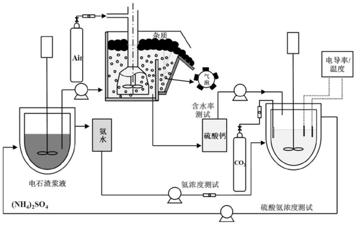 摘要:本發(fā)明公開了一種CO2礦化電石渣制備納米球霰石碳酸鈣方法:電石渣中鈣組分的浸。簩㈦娛c硫酸銨溶液混合,攪拌反應過濾得到含鈣中間產(chǎn)物和濾液;含鈣中間產(chǎn)物浮選除雜:將含鈣中間產(chǎn)物加水和混合后添加浮選劑進行浮選,浮選后的含鈣產(chǎn)物經(jīng)過濾得到固相二水硫酸鈣;碳化反應:將二水硫酸鈣加水充分攪拌混合得到含鈣漿體,將濾液加入含鈣漿體中并同時通入CO2氣體碳化得到碳酸鈣產(chǎn)物,再加入分散劑繼續(xù)攪拌后繼續(xù)通氣終止碳化反應,進行固液相分離得到納米球霰石型碳酸鈣。該方法以硫酸銨作為電石渣浸取劑通過分步式溫和礦化工藝來獲取納米球霰石碳酸鈣的方法,可以得到純度及白度較高的納米球霰石型碳酸鈣。