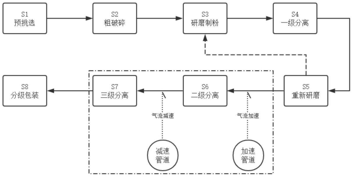 摘要:本發(fā)明公開了一種多級分離自控速式重質(zhì)碳酸鈣的制備工藝,屬于碳酸鈣制備領域,一種多級分離自控速式重質(zhì)碳酸鈣的制備工藝,包括如下步驟:預挑選;粗破碎;研磨制粉;一級分離;重新研磨;二級分離;三級分離;分級包裝,可以通過在進行相對應級別分離前,通過加速管道和減速管道對氣流的速度進行調(diào)節(jié),有效保證重質(zhì)碳酸鈣分離的效果,對分離設備進行保護,進而使得重質(zhì)碳酸鈣能夠正常制備,提高制備質(zhì)量,并且能夠有效省去后續(xù)分離過程增氣提速的步驟,在減少外部氣流對分離設備內(nèi)部氣流進行沖擊和影響的同時,有效節(jié)省壓縮機的投入和能量損耗,降低重質(zhì)碳酸鈣的制備成本,提高其的經(jīng)濟效益。