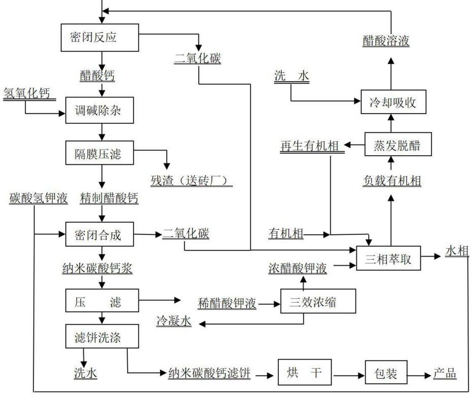 摘要:本發(fā)明涉及無機合成技術領域,公開一種循環(huán)制備納米碳酸鈣的工藝方法,本方法采用石灰石為原料,醋酸溶液為溶劑,兩者反應制備醋酸鈣溶液和二氧化碳氣體,制得的醋酸鈣溶液與碳酸氫鉀溶液合成納米碳酸鈣,液固分離后的溶液為醋酸鉀溶液,該溶液在通入二氧化碳的情況下用高沸點有機胺配制的有機相進行萃取醋酸,萃余液即是碳酸氫鉀溶液,經(jīng)濃縮后用于合成,有機相通過負壓蒸發(fā)獲得醋酸溶液并使有機相再生;本發(fā)明除了消耗石灰石外,其他物質(zhì)基本上都是循環(huán)使用,消耗極少,濃縮碳酸氫鉀和蒸發(fā)醋酸的能耗相對傳統(tǒng)的合成法也大大減少,所以本方法實現(xiàn)了在低能耗、低消耗的生產(chǎn)條件下生產(chǎn)納米碳酸鈣,同時原料成本低、整體工藝成本也低,實現(xiàn)了綠色環(huán)保地生產(chǎn)納米碳酸鈣。
