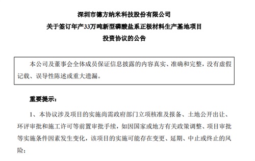 中國(guó)粉體網(wǎng)訊 1月6日,德方納米公告,公司于2022年1月4日召開的第三屆董事會(huì)第二十四次會(huì)議審議通過了《關(guān)于簽訂年產(chǎn)33萬噸新型磷酸鹽系正極材料生產(chǎn)基地項(xiàng)目投資協(xié)議的議案》,經(jīng)友好協(xié)商,公司與曲靖市人民政府、曲靖經(jīng)濟(jì)技術(shù)開發(fā)區(qū)管理委員會(huì)簽訂了《年產(chǎn)33萬噸新型磷酸鹽系正極材料生產(chǎn)基地項(xiàng)目投資協(xié)議》,公司擬在曲靖經(jīng)濟(jì)技術(shù)開發(fā)區(qū)建設(shè)“年產(chǎn)33萬噸新型磷酸鹽系正極材料生產(chǎn)基地項(xiàng)目”,項(xiàng)目總投資約人民幣75億元。