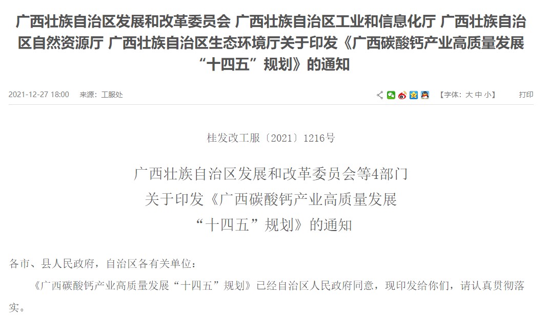中國粉體網(wǎng)訊 2021年12月,廣西壯族自治區(qū)發(fā)展和改革委員會、工業(yè)和信息化廳、自然資源廳、生態(tài)環(huán)境廳4部門聯(lián)合印發(fā)了《廣西碳酸鈣產(chǎn)業(yè)高質(zhì)量發(fā)展“十四五”規(guī)劃》(桂發(fā)改工服[2021]1216號)。碳酸鈣產(chǎn)業(yè)是廣西重點培育的千億元產(chǎn)業(yè),推進碳酸鈣產(chǎn)業(yè)高質(zhì)量發(fā)展,對于積極承接?xùn)|部產(chǎn)業(yè)轉(zhuǎn)移、實現(xiàn)優(yōu)勢資源集約節(jié)約利用和綠色發(fā)展具有重大意義。