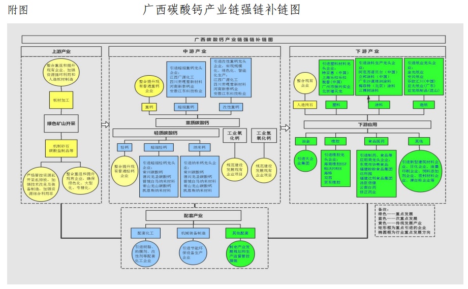 賀州市。依托龍頭企業(yè),整合賀州市重質(zhì)碳酸鈣企業(yè),延伸下游產(chǎn)業(yè)鏈,積極引進塑料、涂料、橡膠、PVC建材、木塑和食品醫(yī)藥等下游應(yīng)用企業(yè),構(gòu)建重質(zhì)碳酸鈣產(chǎn)業(yè)集群。加快建設(shè)中資碳酸鈣新材料產(chǎn)業(yè)園、續(xù)寶產(chǎn)業(yè)園以及和立鑫產(chǎn)業(yè)園“三大特色產(chǎn)業(yè)園”,構(gòu)建輕質(zhì)碳酸鈣產(chǎn)業(yè)集群。