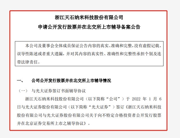 1月10日,新三板公司天石納米發(fā)布公告稱,公司于2022年1月6日與光大證券簽訂了北交所上市輔導協(xié)議。2022年1月7日,公司向浙江證監(jiān)局提交了北交所上市輔導備案申請材料。2022年1月10日,浙江證監(jiān)局對公司報送材料予以受理。