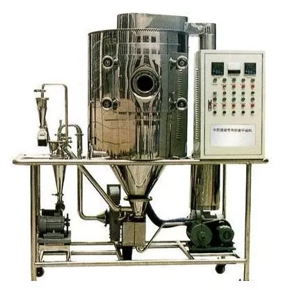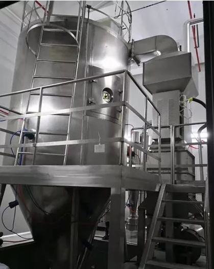 空氣通過過濾器和加熱器,進(jìn)入干燥器頂部的空氣分配器,熱空氣呈現(xiàn)螺旋狀均勻進(jìn)入干燥器。料液由料液槽經(jīng)過濾器由泵送至干燥器的離心霧化器,使料液噴成極小的霧狀液滴,料液和熱空氣并流接觸,水分迅速蒸發(fā),在極短時(shí)間內(nèi)干燥為粉末狀成品,成品由干燥塔底部和旋風(fēng)分離器排出,廢氣由風(fēng)機(jī)排出。