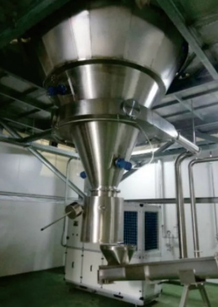 本機(jī)組采用高速離心機(jī)理,使料液在霧化中產(chǎn)生的霧粒距離短,形成細(xì)微霧滴,在傳熱換熱介質(zhì)中,其霧粒實(shí)現(xiàn)瞬間干燥。本機(jī)組采用旋切進(jìn)風(fēng)與防粘壁相結(jié)合進(jìn)風(fēng)技術(shù),有效地解決噴霧干燥粘壁嚴(yán)重的世界性技術(shù)難題:采用除濕冷卻技術(shù)、并應(yīng)用潔凈集中收料技術(shù)、采用智能PLC編程自動(dòng)控制技術(shù)等多項(xiàng)新技術(shù),從而使本機(jī)組達(dá)到世界先進(jìn)水平。