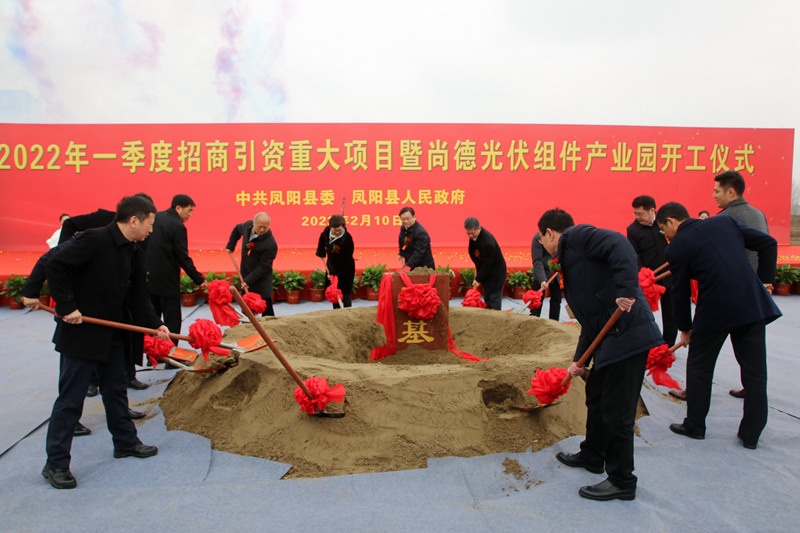 中國(guó)粉體網(wǎng)訊 2月10日上午,鳳陽(yáng)縣2022年一季度招商引資重大項(xiàng)目暨尚德光伏組件產(chǎn)業(yè)園開工儀式在位于鳳翔大道與中都大道交叉口的尚德光伏組件項(xiàng)目現(xiàn)場(chǎng)舉行。市、縣領(lǐng)導(dǎo),無(wú)錫尚德太陽(yáng)能電力有限公司、尚德新能源投資控股有限公司相關(guān)負(fù)責(zé)人等出席開工儀式。