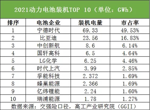 中國(guó)粉體網(wǎng)訊 2021年中國(guó)新能源汽車(chē)銷(xiāo)售約302.9萬(wàn)輛,同比增長(zhǎng)143%;動(dòng)力電池裝機(jī)量約139.98GWh,同比增長(zhǎng)128%。其中,寧德時(shí)代2021年動(dòng)力電池裝機(jī)量69.33GWh,同比增長(zhǎng)132%,國(guó)內(nèi)市場(chǎng)占有率達(dá)到49.53%,領(lǐng)先第二名比亞迪市占率超32%。