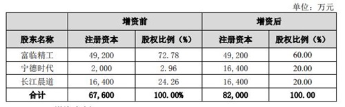 公告稱,本次增資完成后,寧德時(shí)代將持有目標(biāo)公司20%的股權(quán),目標(biāo)公司注冊(cè)資本將增加至8.2億元。